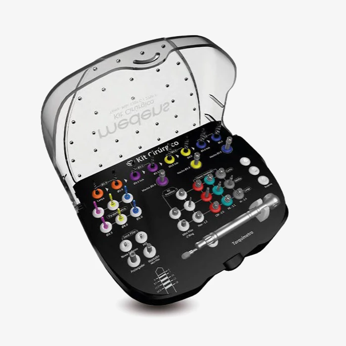 O Kit cirúrgico do HIS permite a instalação de todas as linhas de implantes Medens, HIS, Novo Colosso: Cone Morse, Hexágono Externo e a linha Evolution: Hexágono Interno. O que caracteriza um kit cirúrgico completo.